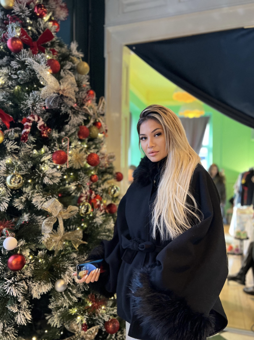 Modelul poarta masura S, dimensiuni model: 170 cm inaltime, solduri 96 cm, talie 71 cm si bust 85 cm.