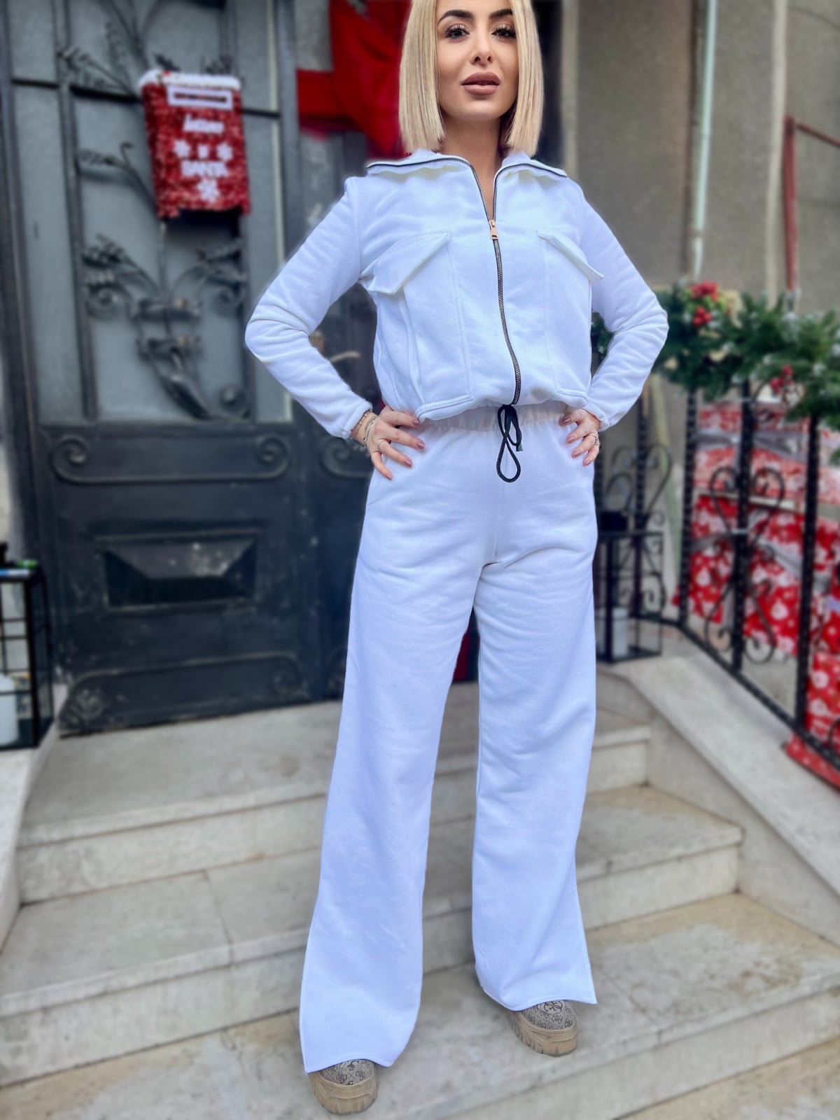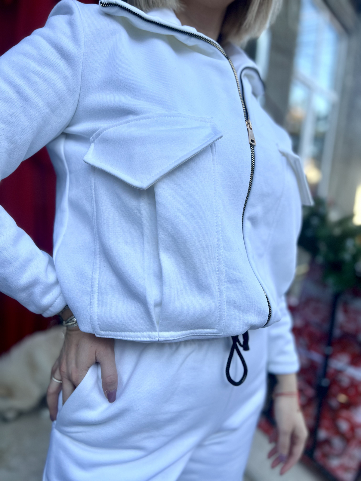 • Format bluza cu fermoar si siret la baza, iar pantalonii sunt drepti pe elastic
